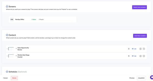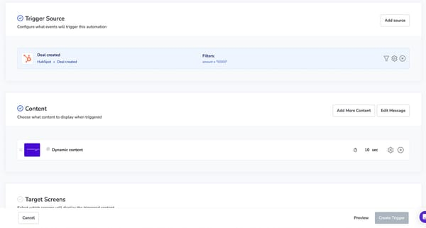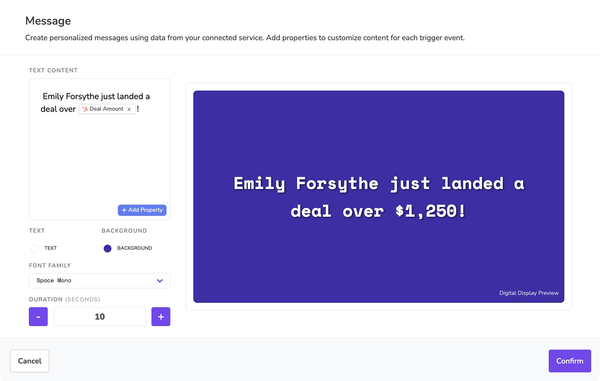 - Customer relationship management software (CRM). Connect platforms like Salesforce and HubSpot (or HubSpot alternatives), then update your signage system whenever data changes (like a deal stage, for example).