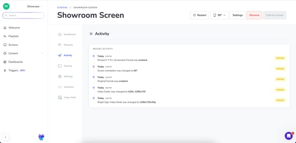 Other quality of life features include remote restarts and app recovery, which lets you resolve simple issues without sending a tech on-site. Some tools, like player logs, provide the detail needed for debugging and root-cause analysis. You should also have access to automated alerts to notify teams if when are issues with your hardware.
