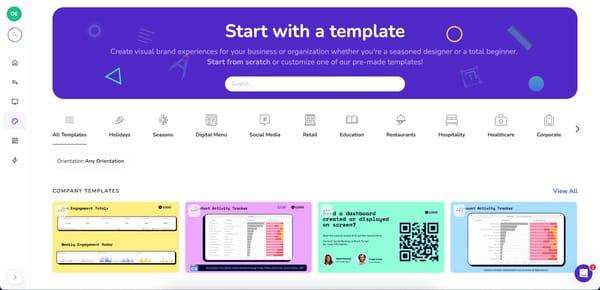- Centralized brand templates. Global teams should be able to define approved layouts for common use cases (think menus, announcements, dashboards, safety messaging) then make them available across the organization.