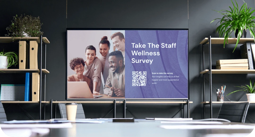 - Create accessible digital signage that displays a playlist of mental health content on key screens, like breakrooms and other employee-only spaces. Then, create an embeddable company TV channel so employees can see the same exact resources from anywhere.