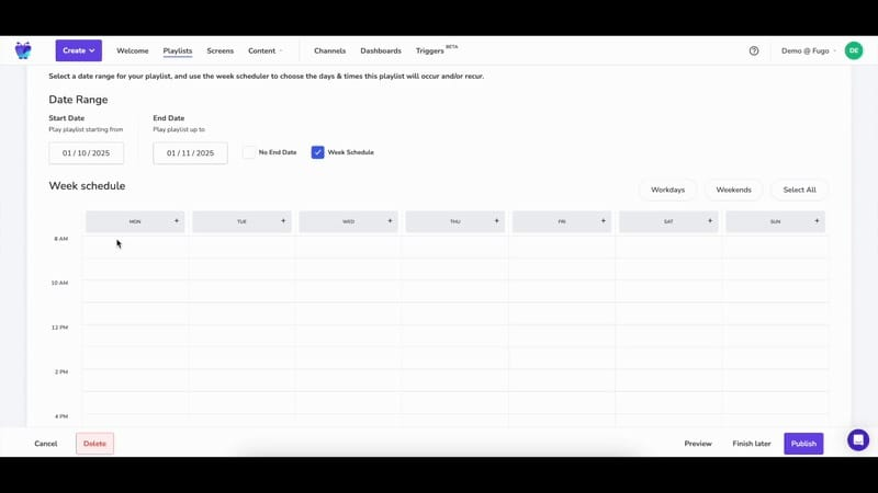One way to do this is with scheduled content, which automatically sprinkles in mental health messaging across your digital signage throughout the day. Set them once, and your screens will update themselves automatically on specific dates, times, or holidays (or at least, until you decide to change the schedule).