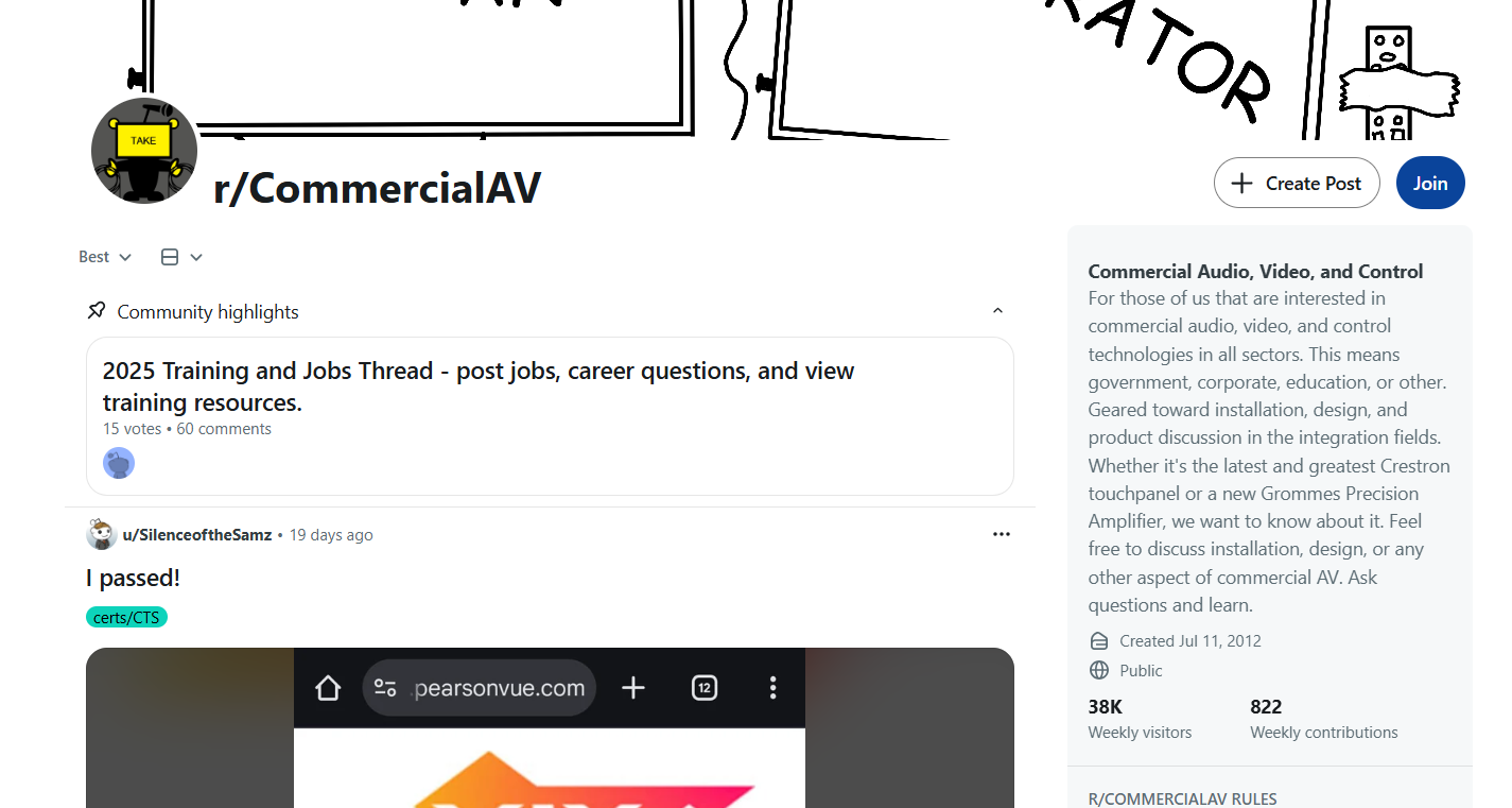 r/CommercialAV is a place where working technicians and integrators can share their unfiltered insights anonymously. Most content revolves around troubleshooting and industry certifications. But you'll also find plenty of product gossip, hiring, and job openings as well.